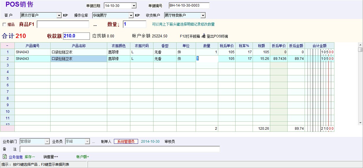 在使用进销存财务软件pos销售时,发现用扫码枪输入与手动选择输入同一款产品税额计算不致的情况,手动选择输入计算的结果正确,扫码枪输入不正确,且等于税后单价。错误内容如图一。(注:业务规则定义如图二)
