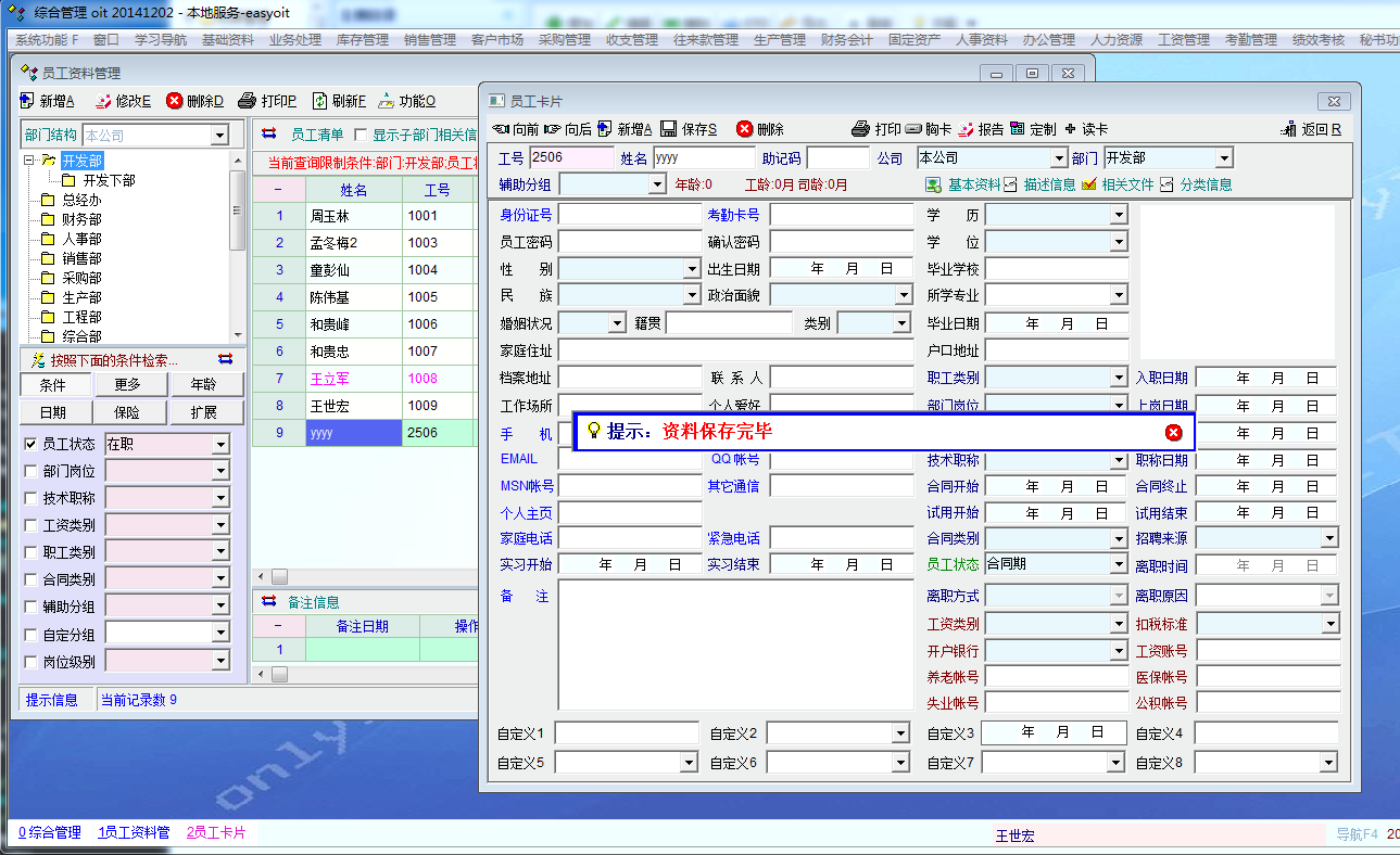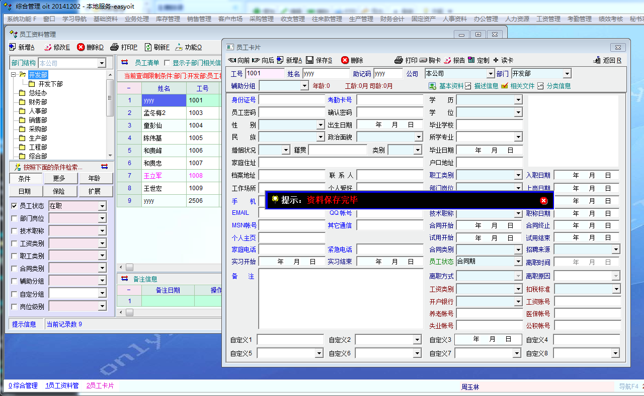 清云 员工工号输入有的工号自动提取原来的资料,不会覆盖。 |