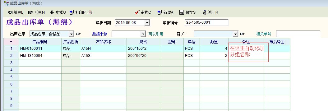 在单据中使用”添加分组/组成产品“后,可不可以在明细备注栏自动添加所选用的分组名称,这样有利于之后的数据核对和统计。