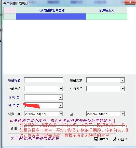 1、如图,将平均分配计划日期的功能改为勾选项,勾选了,跟现有系统功能一样:如果选择了多个客户,平均分配到计划的日期段中;不勾选,则该计划没有全部完成,一直提未有尚未联系的客户,并把尚未联系的客户标示出来。