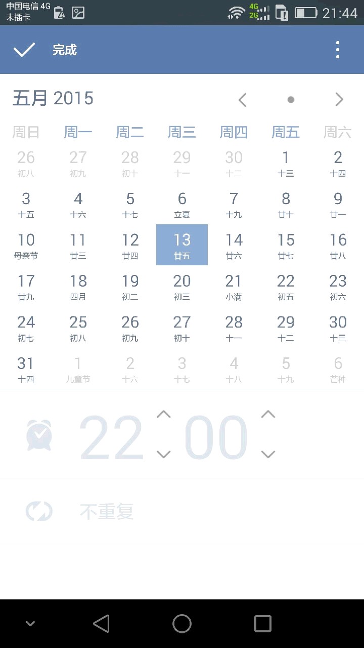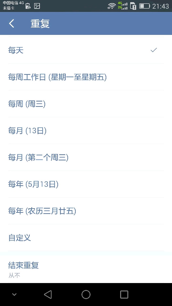 2、增加计划重复循环功能,如图所示,类似滴答清单(一个手机软件)的提示功能,可以选择、制定计划是否需要重复执行及比较灵活的执行、重复时间。