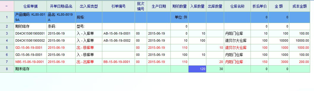 两个入库,一个移库,一个出库,出库20个  成本只有200