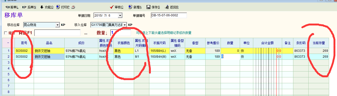 图一是该产品库存明细,图二是单据录入时显示的库存明细。希望调整后能够在录入单据时就显示该产品的明细库存。调整后显示如SOS002 黑色 M1   33件,L1  16件,而不是显示成该产品总数量269件。