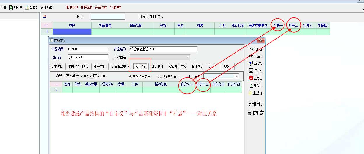 1、产品结构也希望能显示扩展项目,因扩展项是企业根据自身特点而设方便区分产品的,如果可以显示就方便查看,不必退出“产品结构”界面来确认录入材料是否正确。