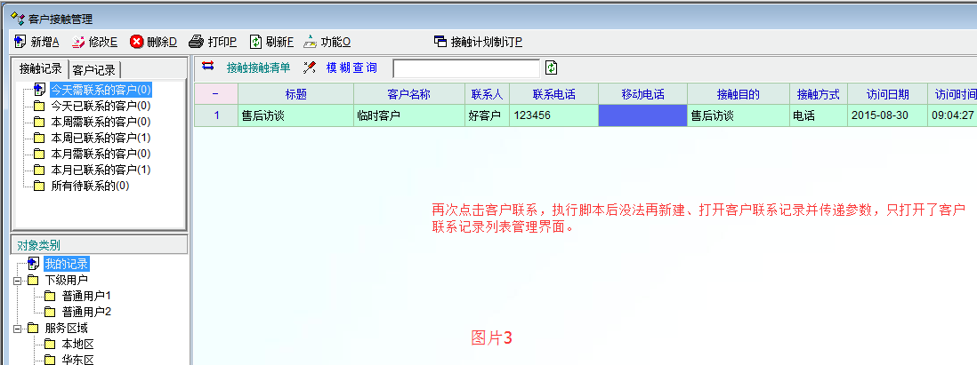 第一次点击自己创建的按钮(客户联系),可以正确执行脚本,传递参数到新窗口。然后,如果再次点击按钮(客户联系),则有两个不正常现象:1、没法重复、正确执行脚本,如图片3所示,没法再次打开客户联系编辑界面并传递参数;2、如图片4所示,原来的客户机会中所有输入的资料全部不见了,就像新增了一条客户机会记录一样。