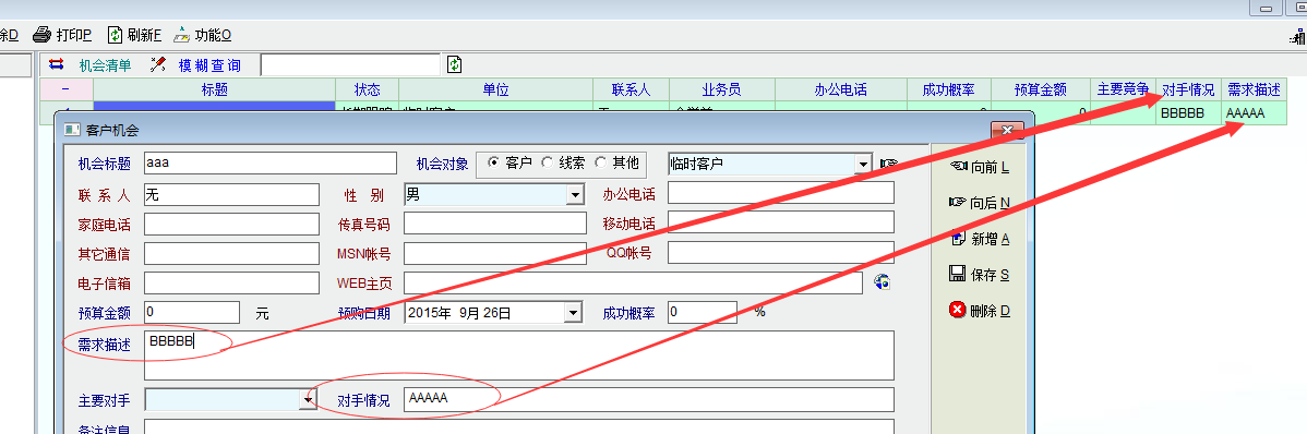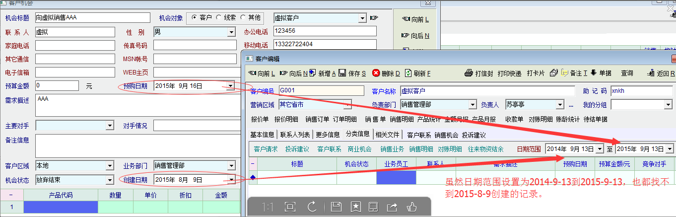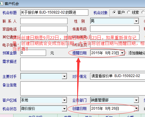 新版中竞争对手情况(rival_note)与需求描述(requirement)两个字段内容搞反、颠倒了已经更正,但创建日期自动更新与客户编辑中检索客户机会的日期以预购日期为标准(而不是以创建日期为标准)问题还是存在!