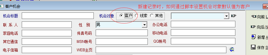 当创建新的商业机会时,如何通过脚本设置机会对象的默认值为客户,尝试过下面几个语句都不行