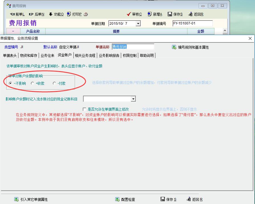 图示为增加费用项目及单据的业务规则定义。