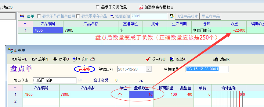 举例:产品编码是7805,基本单位为个,折算单位为条。1条=250个。7805的初始库存为100个,现在的盘点数量是10条(折算成基本单位是250个)。如果在盘点单中如图片1所示输入盘点清单(单位为条,数量为10),当单据保存审核后,7805的库存数量则变成了负数。