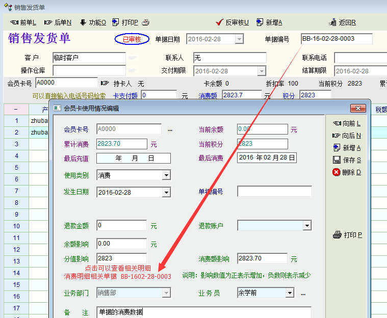 2、会员卡查询:查询会员卡时,除具有查询积分和余额功能外,还希望以列表的方式列出该会员的所有消费单号和消费日期,点击该单号,可调出原始销费单,便于查看其消费项目。(本需求十分有用,急切希望改进)