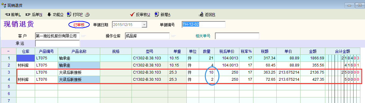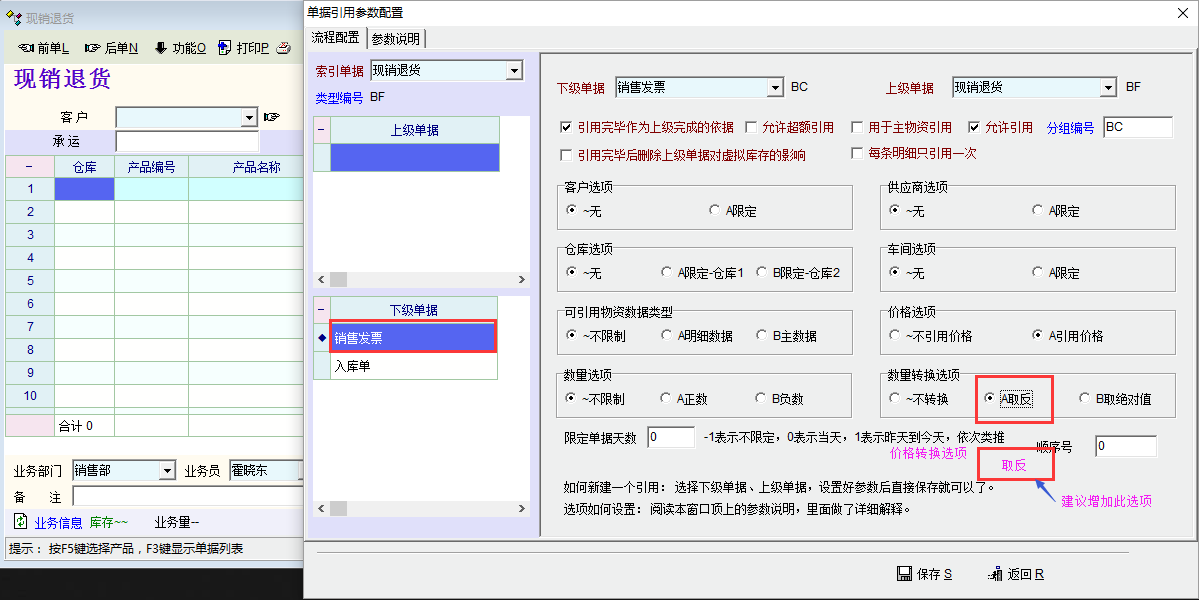 我单位“现货销售“和”现销退货“的下级单据都是”销售发票“,正常情况下”现货销售“生成正数的”销售发票“,”现销退货“生成负数的“销售发票”。但是如果在“现货退货”的引用流程定义中设置了数量“取反”的话,“销售发票”的金额是正确的,但是在“现销退货”明细报表中,下级单据的引用情况就不对了,如图所示。所以建议引用流程中增加“价格转换选项”,或者在统计报表时加以改进,以显示正确的数据。