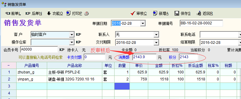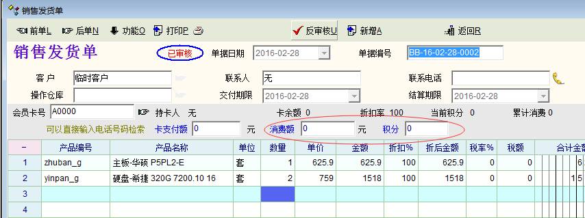 销售发货单中的会员卡功能不能像现货销售中自动输入消费金额与积分。经过测试,发现销售发货单反审核后系统倒是自动输入消费额与积分了