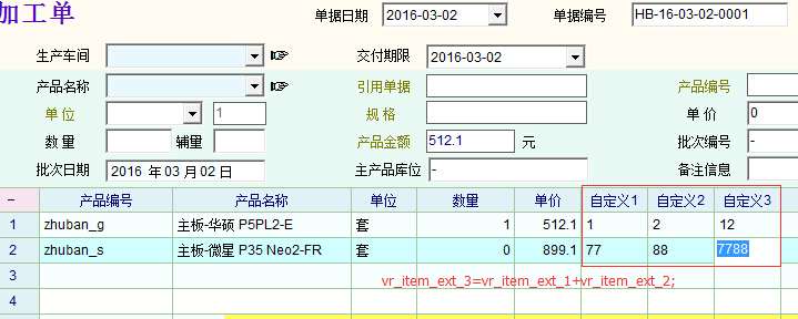 销售单中的自定义列在脚本支持数字运算,比如脚本中定义vr_item_ext_3=vr_item_ext_1+vr_item_ext_2,如3=2+1。但在生产管理中的生产单等单据中的自定义列却不支持数字运算,好像把自定义列的内容当作字符串而非数字处理了,如下图所示。可否将生产管理中的生产单等单据中的自定义列也像销售单中的自定义列一样当做数字,支持数字运算呢?