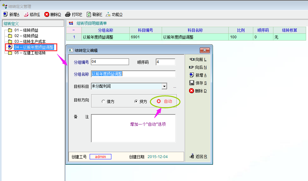 现在的结转凭证模板,在新增时需要指定目标科目的方向,但是实践中,由于会计科目余额方向的不同,结转凭证中目标科目的方向是不确定的。如果指定了目标科目的方向,结转时经常会出现会计科目和目标科目的金额是负数,既不严谨也不符合日常习惯。因此,建议在新增结转模板时,目标科目的方向增加一个“自动”选项,根据会计科目的余额方向自动确定目标科目的方向,保证金额不为负数,这样就好多了。 举个例子:以前年度损益调整科目的余额可能在借方,也可能在贷方,那么结转时,目标科目(利润分配-未分配利润),也就既可能在贷方也可能在借方。同样,在月末结转损益时,由于目前的限制,一般是用两个结转凭证,一个是利润结转,一个是费用结转。如果目标科目(本年利润)的方向能够设置为“自动”,那么只要设置一个结转模板就可以了。 |