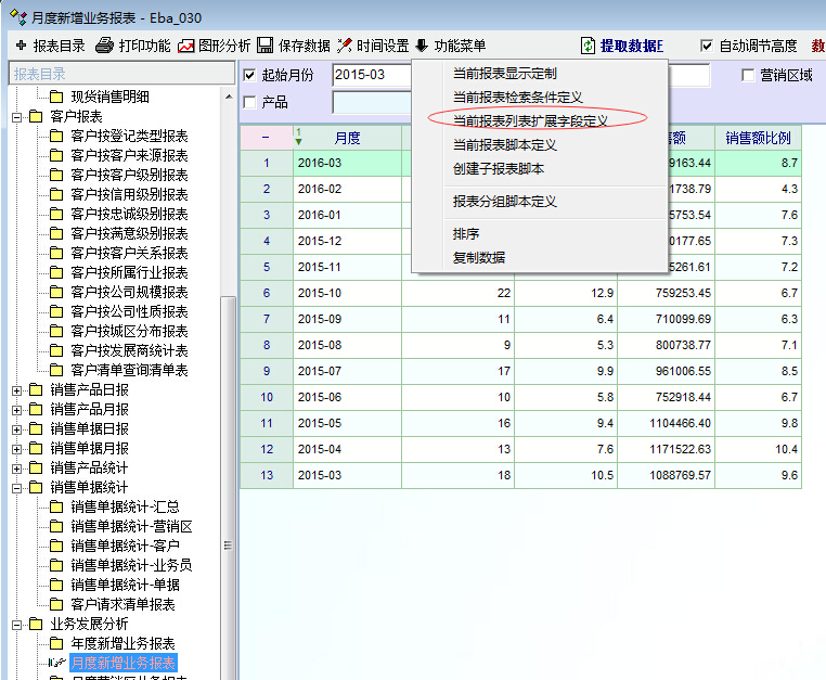 计算报表中一些列的比例是非常常见的,系统中并没有这方面的列。这时,可以通过脚本扩展完成。 如图,先扩展报表字段,再添加如下脚本就可以了。 int rep_change() { return 1; }; int load_ext() { return 1; }; int show_row_ext() { num num1,sum_num1,ratio1_result,num2,sum_num2,ratio2_result; num1=grid_get_v("MG","num",change_row_id); sum_num1=grid_get_col_sum("MG_Sum","num"); ratio1_result=num_dec_cut((num1/sum_num1)*100,1); num2=grid_get_v("MG","tot_sell_amount",change_row_id); sum_num2=grid_get_col_sum("MG_Sum","tot_sell_amount"); ratio2_result=num_dec_cut((num2/sum_num2)*100,1); grid_set_v("MG","ratio1",change_row_id,ratio1_result); grid_set_v("MG","ratio2",change_row_id,ratio2_result); //change_row_id 表示当前行 return 1; }; int load_over() { return 1; }; int dbl_click() { return 1; }; int main() { return 1; }; |