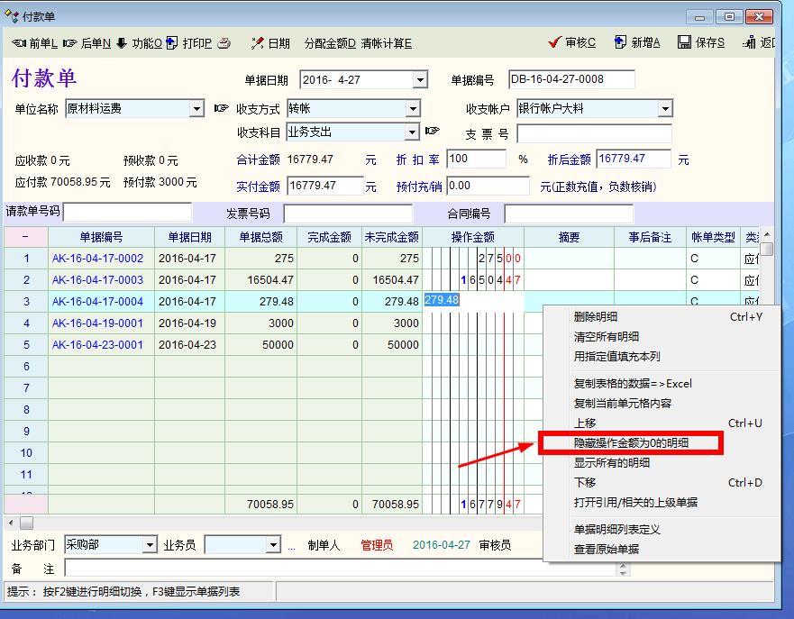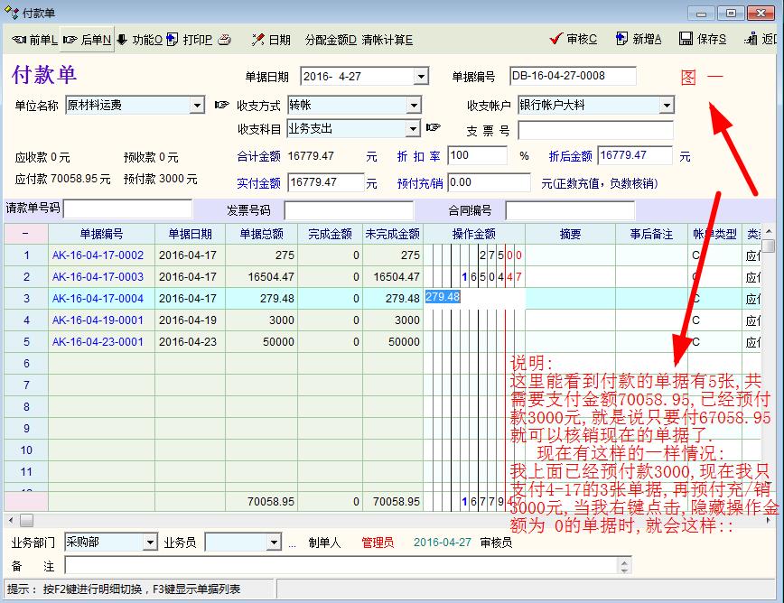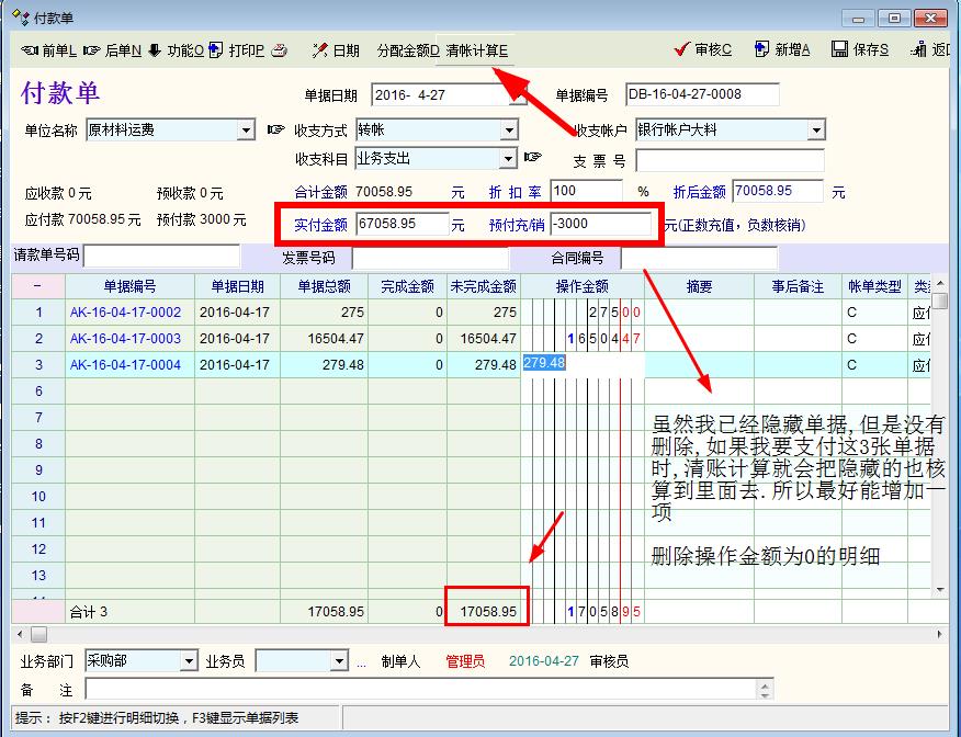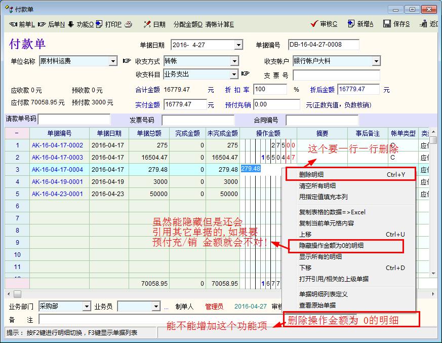 问题一,建议在采购管理与销售管理增加单独录入费用核算! 个人认为: 因为很多时候采购与销售的物流费用是单独支付的,虽然现在有费用一与费用二可以添加,但是在应付核销的时候会把本来属于运费的金额多支付给供应商与客户这是不方便的,虽然应付的时候可以不支付运费部分可是这样会核销不完全! 方法1: 把采购管理与销售管理的金额与费用独立分开。 方法2:在采购与销售时只添加品种的金额不添加数量,OIT是不会自动运算的,如果可以直接增加金额也会运算,也是一种解决方法, 方法3:在核销的时候可以选择性的支付金额与费用一,费用二, 方法4:把采购管理与销售管理的金额与费用一,二独立一些,同时在核销的时候可以选择性的支付金额与费用,这样最完美!!! ------------------------------------------------------ 问题二, 有时候有些小数是扣除的, 付不完全, 能不能在收付款那里增加引用完成标志,就好像单据上下级引用一样,!! --------------------------------------------------------------- 问题三, 在付款单明细下面右键菜单,有个功能项要改动一下,如果 清账核销的时候,只核销部份单据时,点击 隐藏操作金额为0的明细后,再点清账核销,就会把已经隐藏为0的单据也核销在里面.能不能右键菜单增加一项: 删除操作金额为0的明细,这样就核销就不会把已经隐藏的单据连在一起核销!! 问题如下图: |