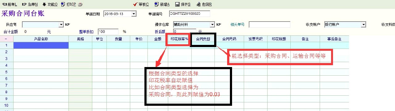 在采购自定义单据中:合同类型能选择,比如:采购合同、运输合同等,印花税率列在根据选择的合同类型自动赋值?比如:合同类型选择为采购合同,则印花税率自动赋值为0.03%。