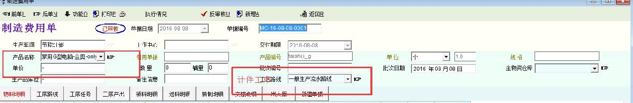 第四步,材料价格和销售费用都有了,如果我们有“制造费用”的话,这个销售成本单就完完了。 我们创建下级单据--制造费用单。 费用制造单类同于“生产单”,引用销售成本单的单一条明细物料。选择“计件工序路线”。 |