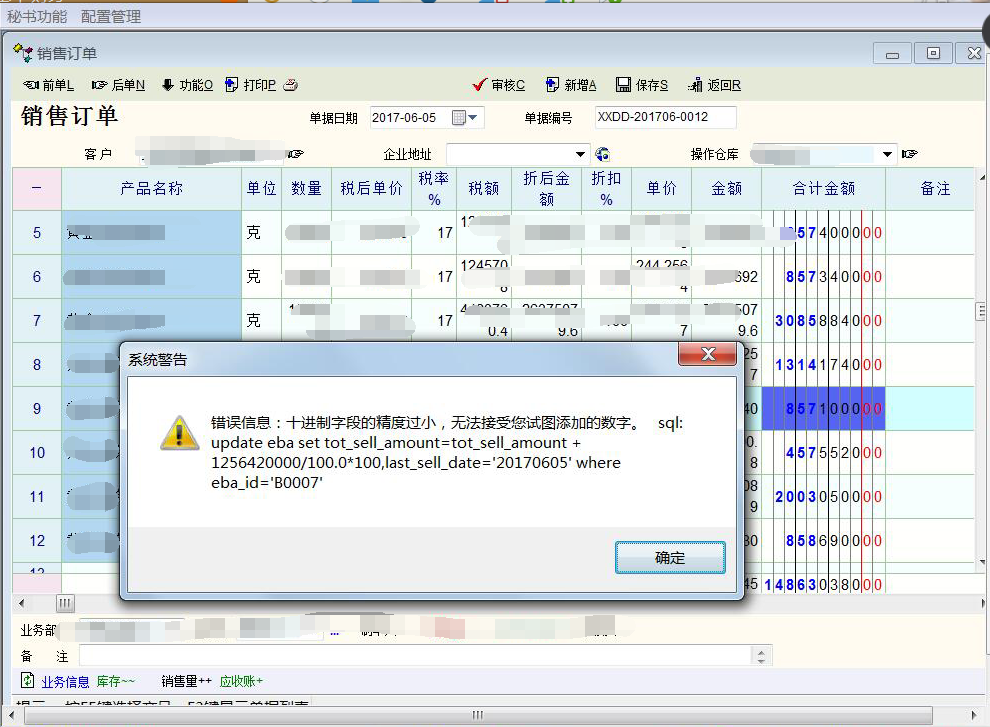 销售订单无法审核,提示精度过小,