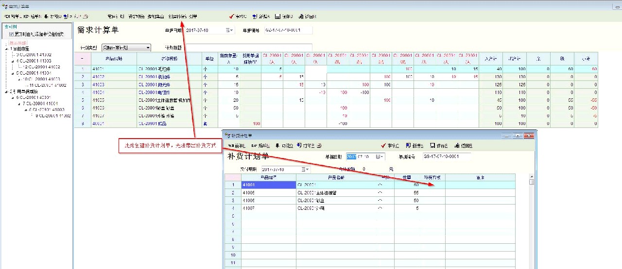 例如我上面例子,客户下了CL-20901产品100套,需求分析单,只能算出需求补100套产品,需不能计算出要补多少原材料和配件。