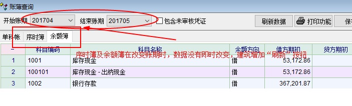 “序时簿”及“余额簿”在改变账期时,数据没有即时变更,建议增加“刷新”按钮