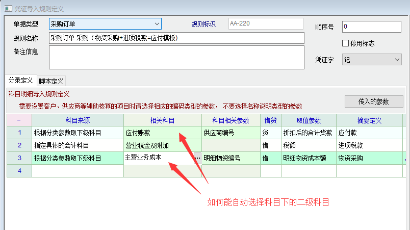 在用采购订单导入凭证时不能自动取科目的二级科目。还有在凭证上修改科目产品编码就会消失这些要如何解