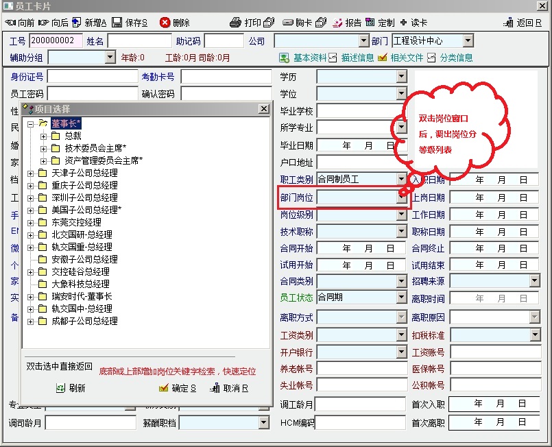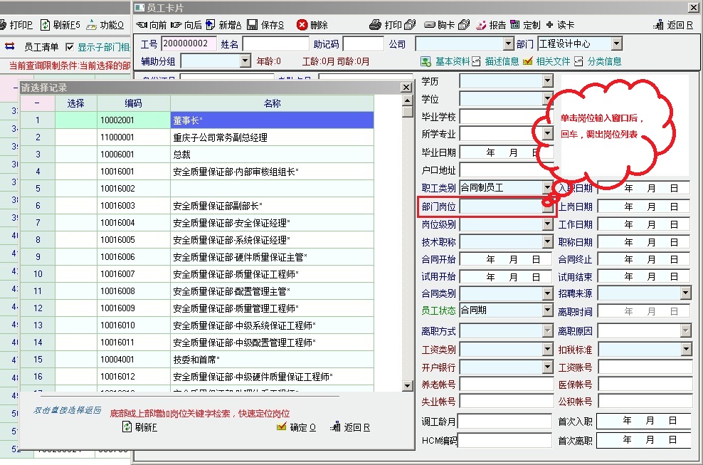 1、新员工建档录入“部门岗位”