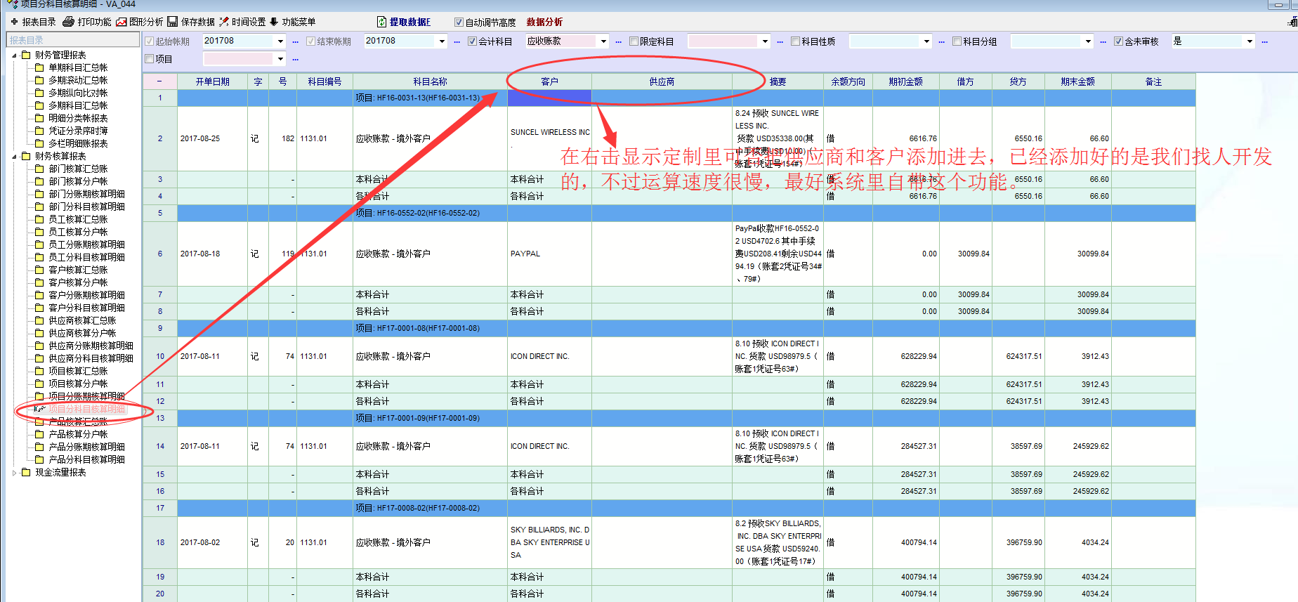 客户分科目核算明细表 右击显示定制 添加项目号分类