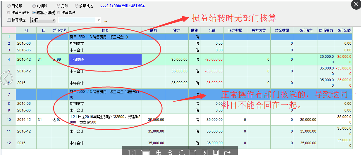 损益核算的损益类科目,在期末结转时没有了核算,导致部门核算明细账查询期末不为0