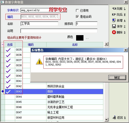 问题:若 构成 组合码 的 各项目编码 较多,收到 组合码“编码”长度的限制,可能无法保存(系统报错,编码过长)