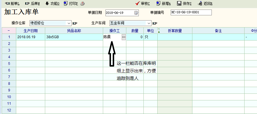 库存清单中能否显示  加工单中 操作工一栏 显出,这样有方便追踪到最新入库是谁生产的,