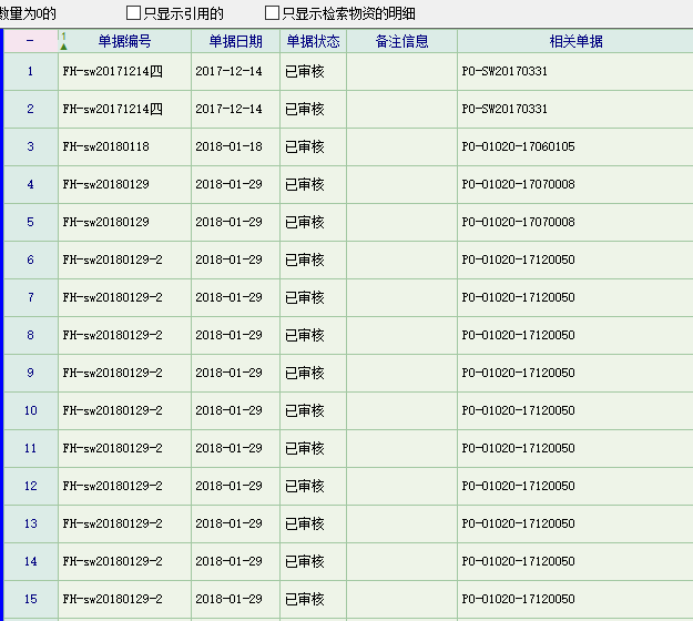 图一是销售开票引用明细上显示的FH-sw20180129-2对应相关单据号情况  可以看到均为PO-01020-17120050