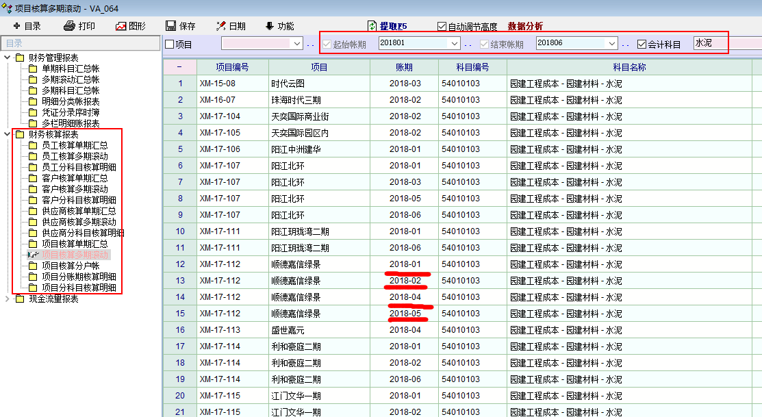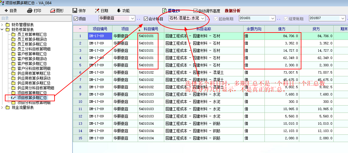 选择多个科目时,多期汇总不是一个科目一个汇总数,而是分多行显示,如同滚动一样!这样还是不太方便取得一个时期内的汇总数,建议老师还是完善一下。