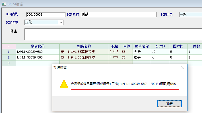 问题是:同一材料,同一工序,不同部位。例如制衣的布料,用同一布料、工序为“裁剪”,部位为衣袖、前幅、衣领。在录入BOM时分三行录入还是用手工加总用量后录入一行?如果分三行录入就应取消限制。