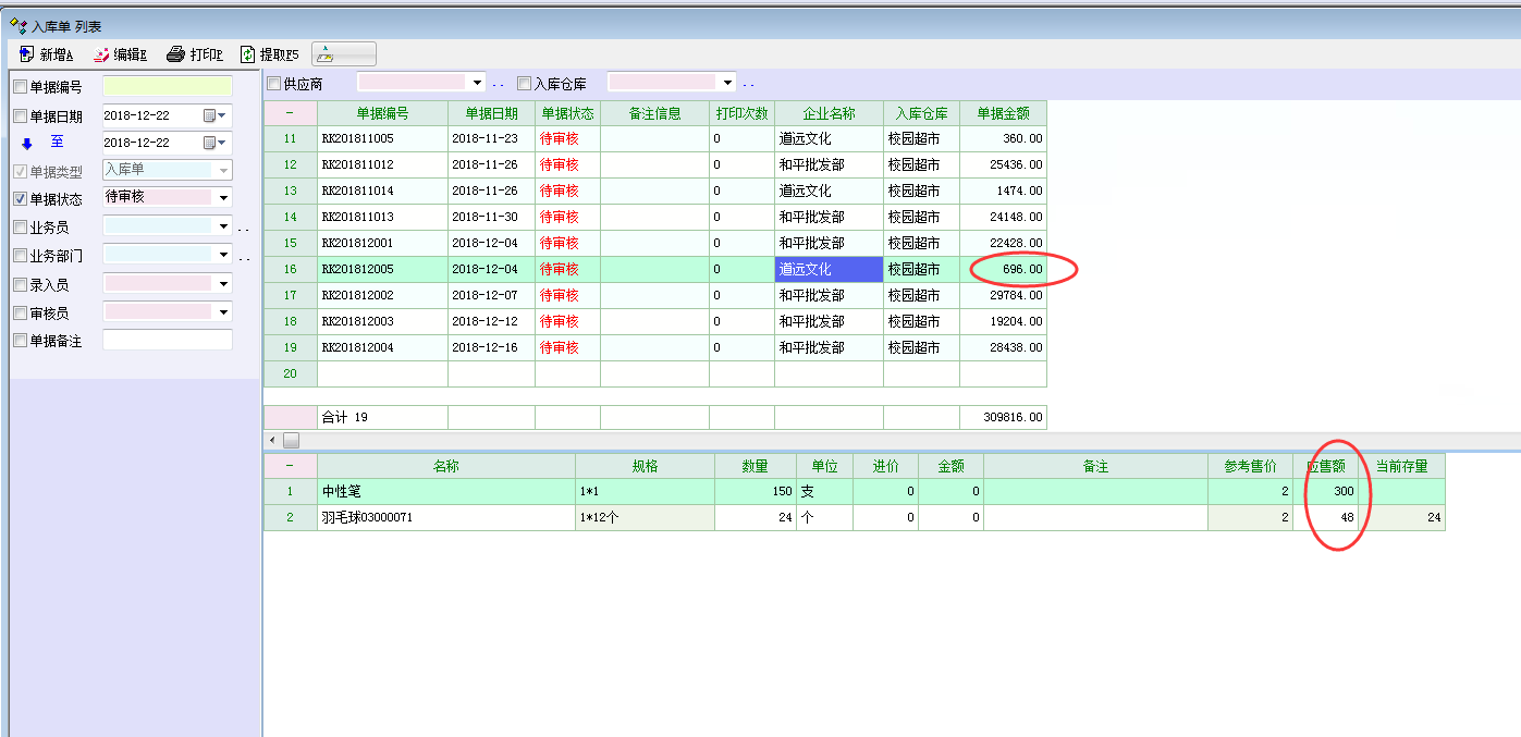 入库单明细的合计金额就成倍了,不知是什么原因造成的