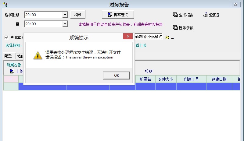 以前使用模板是能正常生成财务报告的,最近突然不能生成财务报告了,提示:调用表格处理程序错误