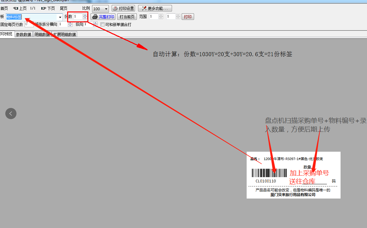 1,采购部创建采购订单--选择打印模板1(打印采购单发给供应商和仓库收料人员)--单据上有个功能按钮【打印物料标签】【打印采购物资的条码标签,我们要提前打好条码标签交给仓库收货的人员,因为有很多材料我们要到物流点去自提,打印条码标签最好是能够在oti软件打印,这样我们能少安装软件,oit打印的时候会根据物资的折算数量,比如我采购1030码面料=20支30Y,这个20(自动换算成21)来决定打印物料标签的数量,在物料标签上面除了打印品名、编号(我们把编号做条码),还要打印本采购单的单号,以及默认送往的仓库名字】