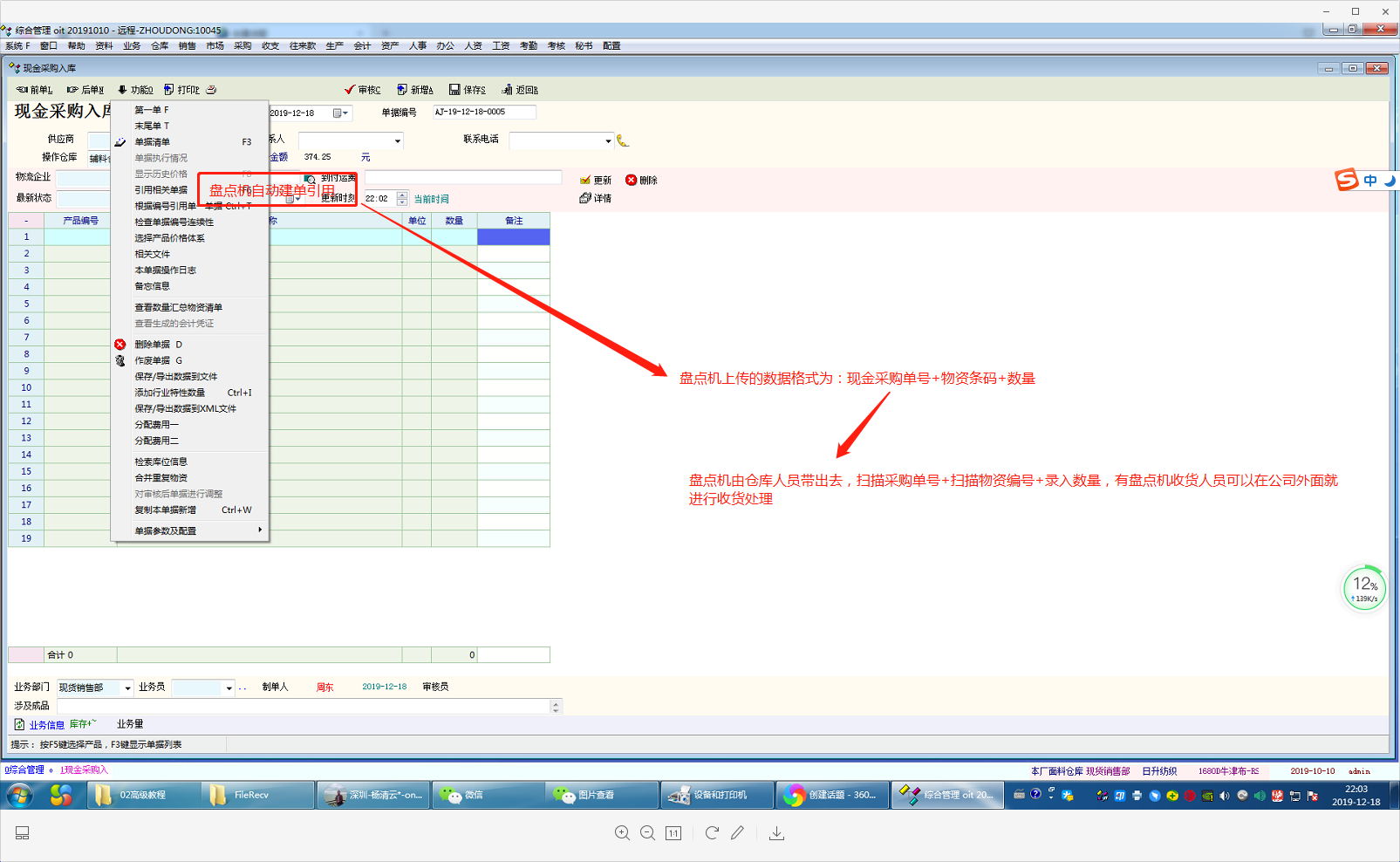 2.仓库人员接收到这些条码标签实物+采购单实物,带着这两个东西去物流点提货,提货的时候用盘点机先扫描采购单号再扫描产品编号再填入数量,等他配送完这些材料(这些材料不一定会拉到本公司仓库,可能会直接送到其它仓库)回到公司,拿出盘点机,打开oit系统,打开采购收货单据(引用采购单)或某种输入界面,直接把条码枪的数据(数据格式为:采购单号+产品编号+数量)传入某输入框,接下来直接自动实现(建立采购收货单据+自动引用产品编号的物资+收货到的数量)--手工校对--审核