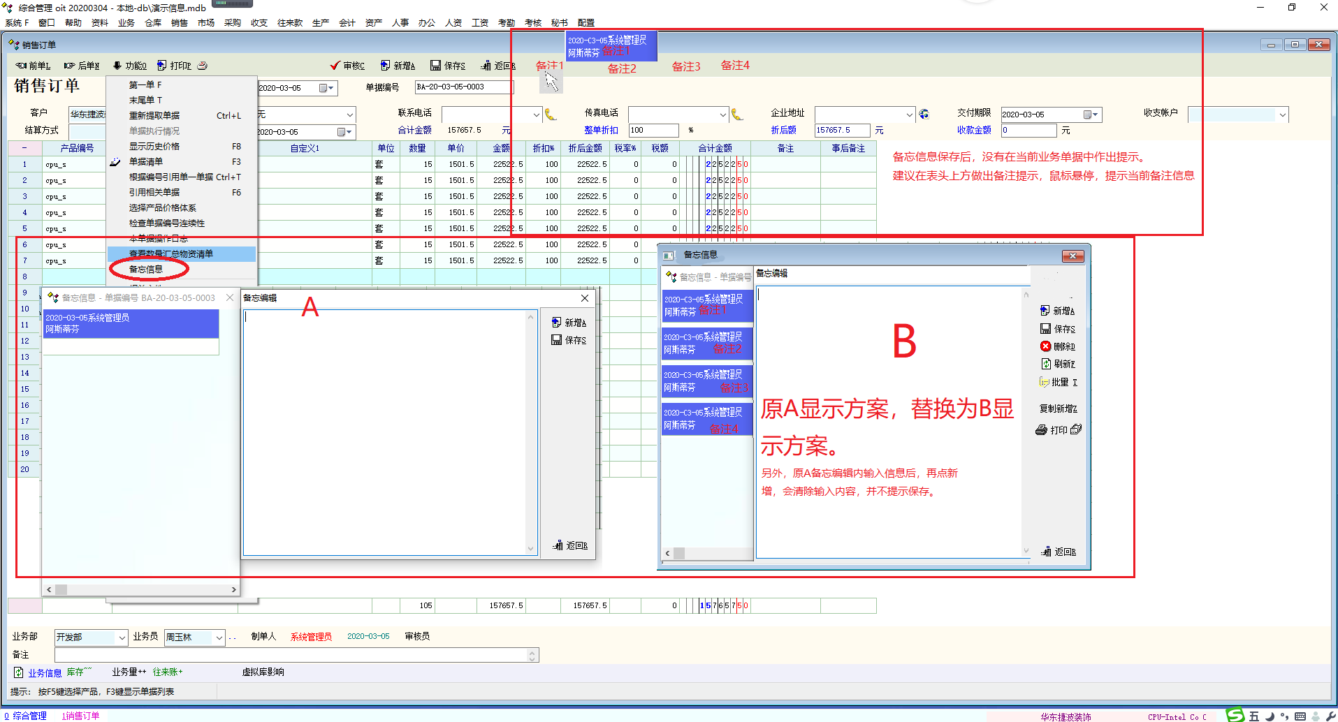 业务单据增加备忘信息后,在当前业务单据中没有提示信息,无法确认些单据是否有备忘信息建议增加对应提示信息  如图