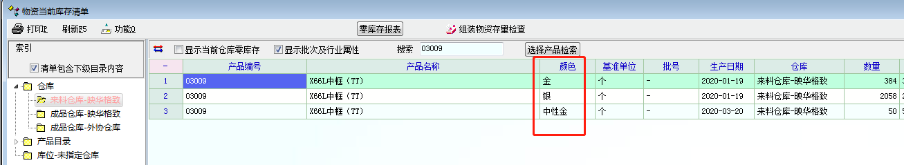 公司一个产品,按色进行区分库存,在库存清单中能正常显示各种色的库存信息,但是在库存物资警戒设置管理中却看不到色,进入软件弹出的分仓库告警报表中也看不到相应的色的预警,请老师帮忙看看。