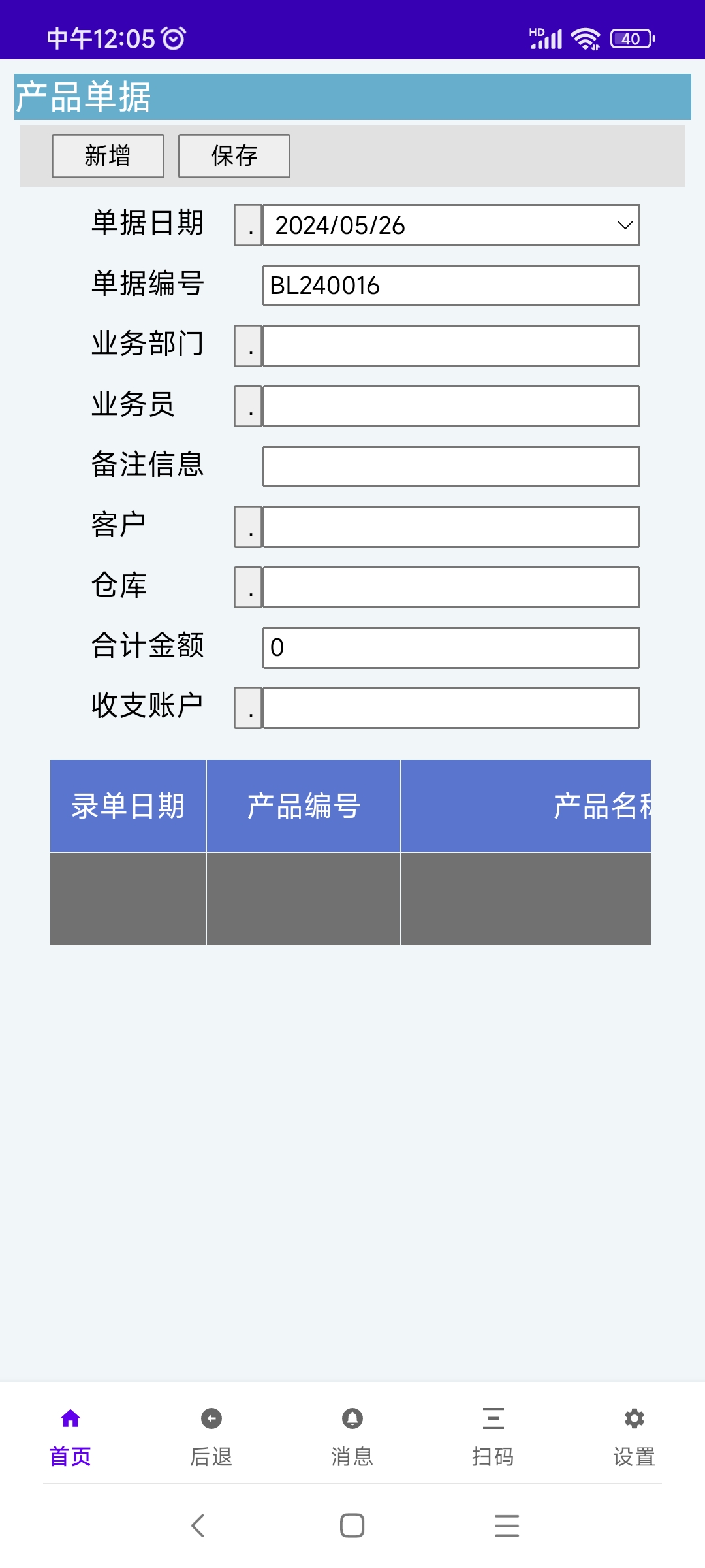 新建单据建议在这个界面,直接添加扫产品条码功能,扫出的条码直接跳到产品选择改价格与数量,这样可快捷添加产品。这个功能对零售行业有很大的帮助!另外这个界面的业务部门\业务员\仓库\收支账户,不要显示空白,直接默认为登录帐号默认方式。